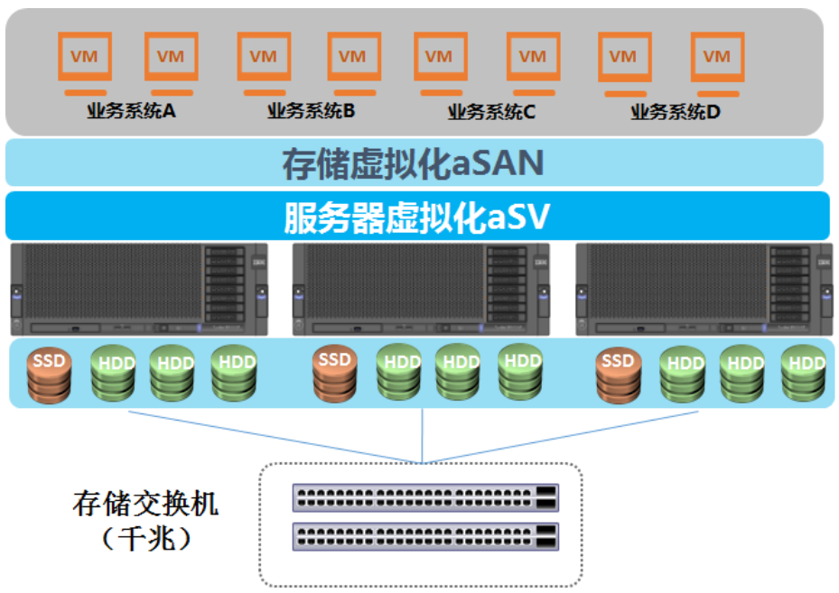 經過對(duì) VMware、深信服、華為(wèi)等方案的(de)考察,該集團最後選用(δyòng)我公司提供的(de)深信服超融合解決方案進行(xíng)數(shù)據中心的(de)升級改造。整個(gè)項φ目采用(yòng)了(le)3台配置 2*E5-2660V3/256GB內(nèi)存/2*480GB SSD,6*4TB SATA,超融合一(yī)體(tǐ)機(jī)。同時(shí★)采用(yòng)兩台獨立的(de)千兆交換機(jī)作(zuò)為(wèi)分(fēn)布式存儲的(de)÷數(shù)據同步通(tōng)道(dào)。在3台服務器(qì)搭建起的(de)超融合資源池中,采用(yòng)P2V的(de)方式,ε将原有(yǒu)30+個(gè)物(wù)理(lǐ)服務器(qì)系統遷移到(dào)虛拟機(jī)當中;業(yè)務系統包括Exchange服務÷器(qì),OA服務器(qì)、用(yòng)友(yǒu)ERP系統等。